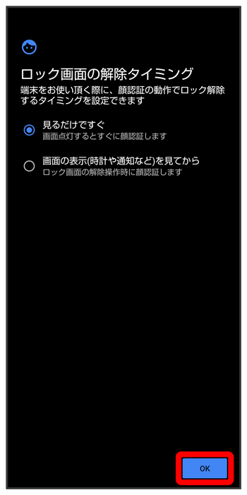 セキュリティ画面でパターン/ロックNo.(PIN)/パスワードを入力顔データの登録後に画面ロックを解除するタイミングを変更する