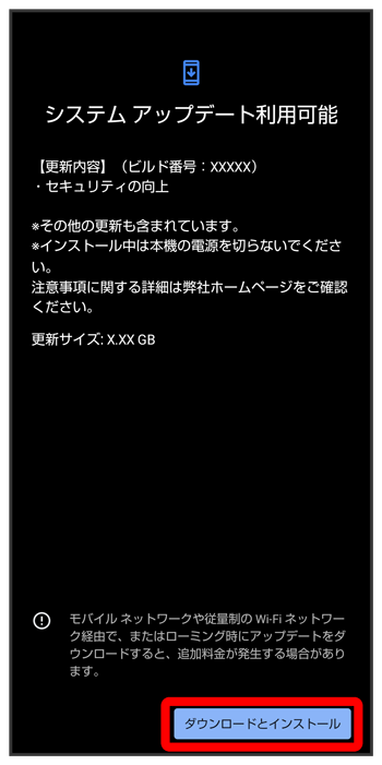 - システムアップデート中もほかの機能を使用できます。ただし、システムアップデートの通知後10日間は、システムアップデート中にほかの機能を使用していると、アップデートのインストールが一時的に停止されます。をタップすると、インストールが再開され、ほかの機能も使用可能になります。
