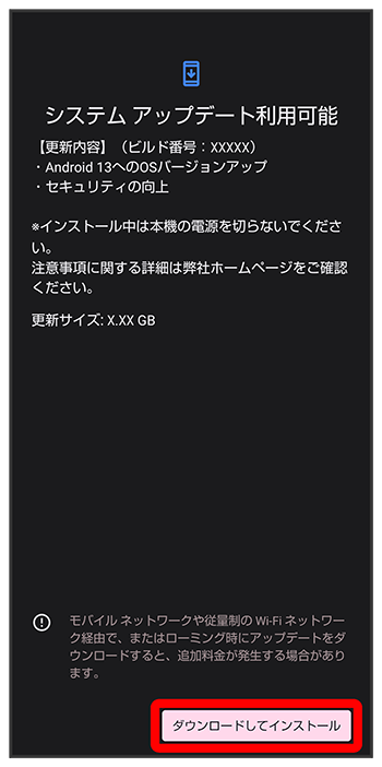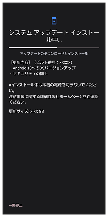 - システムアップデート中もほかの機能を使用できます。ただし、システムアップデートの通知後10日間は、システムアップデート中にほかの機能を使用していると、アップデートのインストールが一時的に停止されます。をタップすると、インストールが再開され、ほかの機能も使用可能になります。