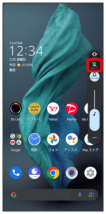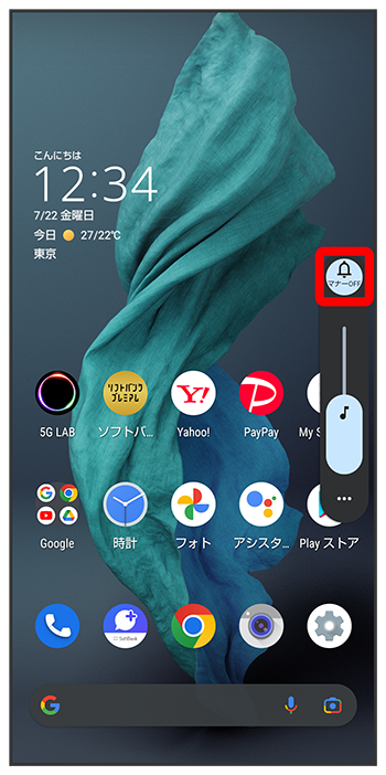 音量Upキー/音量Downキーを押して音量バーを表示させ、マナーモードが解除されます。