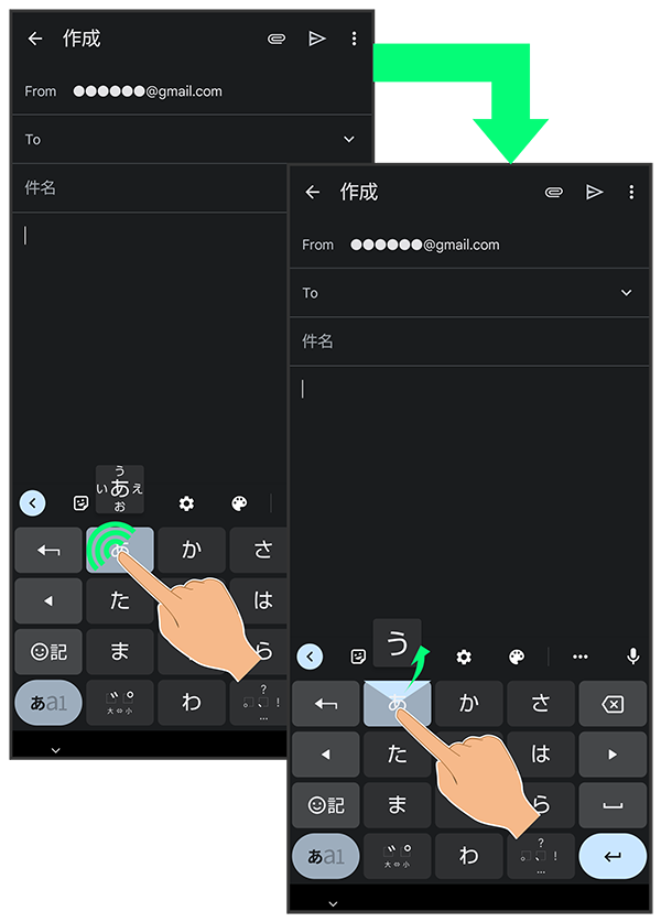- キーをロングタッチすると、キー入力ガイドがポップアップで表示されます。キーをタップしたまま入力する文字の方向へフリックし、入力します。