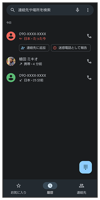 通話履歴一覧画面で確認する相手の名前/電話番号をタップ履歴詳細画面が表示されます。