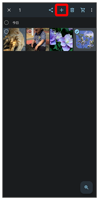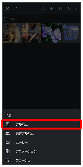 フォト画面で「アルバム」欄から写真/動画を追加したいアルバムをタップ追加したい写真/動画をタップ(- 写真/動画をタップするたびに、選択(