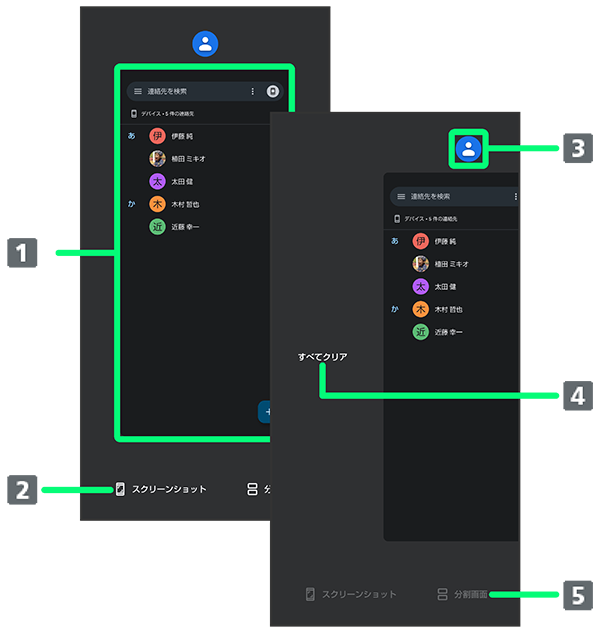 アプリの使用履歴画面で画面に従って操作- アプリの使用履歴画面でアプリの履歴のアイコンをタップと操作しても画面を分割できます。