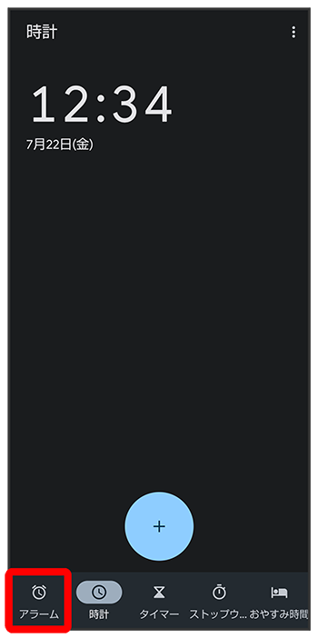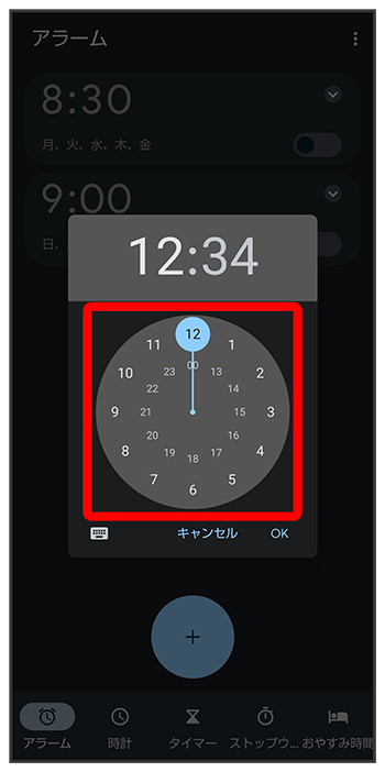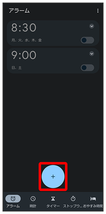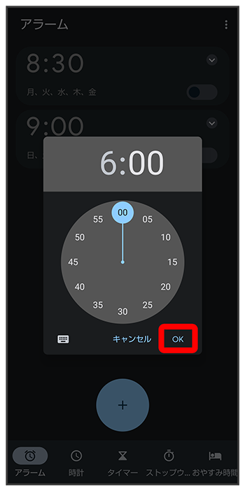 アラーム設定時刻になると、アラーム通知の画面が表示され、アラームやバイブレータでお知らせします。