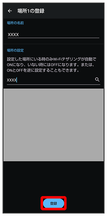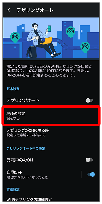 テザリングオート画面で削除したい場所のWi-Fiテザリングが有効になるタイミングを設定する