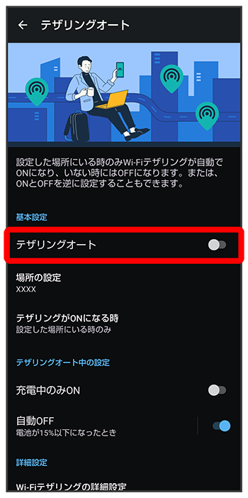 電池残量に応じて、Wi-Fiテザリングを自動的に無効にするかどうかを設定する
