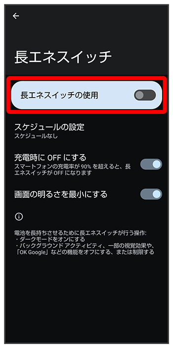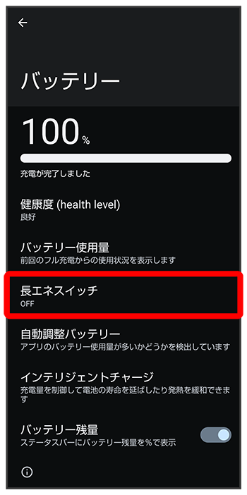 電池残量が90%になったときに長エネスイッチを自動的に無効にするかどうかを設定する