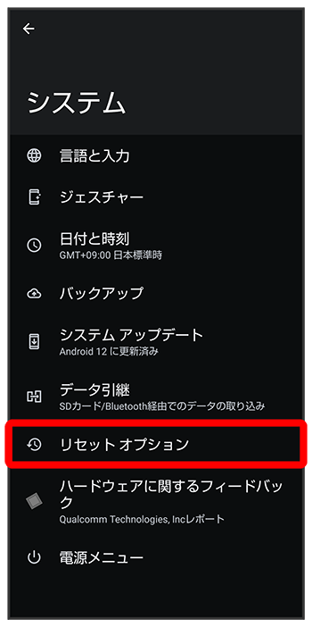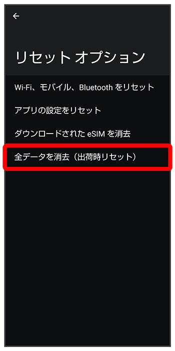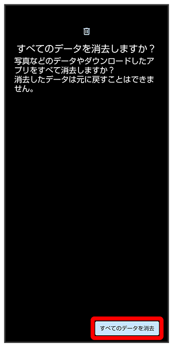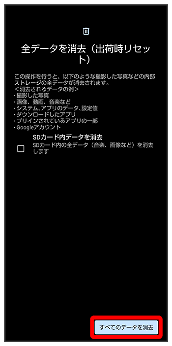 - 全データを消去(出荷時リセット)を行うと、内部ストレージのデータがすべて消去されます。必要なデータは事前にバックアップをとることをおすすめします。