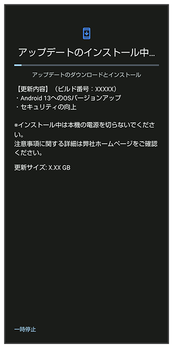 - システムアップデート中もほかの機能を使用できます。ただし、システムアップデートの通知後10日間は、システムアップデート中にほかの機能を使用していると、アップデートのインストールが一時的に停止されます。をタップすると、インストールが再開され、ほかの機能も使用可能になります。