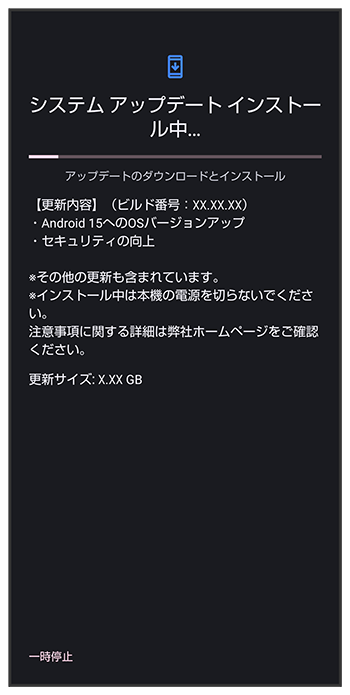 - システムアップデート中もほかの機能を使用できます。ただし、システムアップデートの通知後10日間は、システムアップデート中にほかの機能を使用していると、アップデートのインストールが一時的に停止されます。をタップすると、インストールが再開され、ほかの機能も使用可能になります。