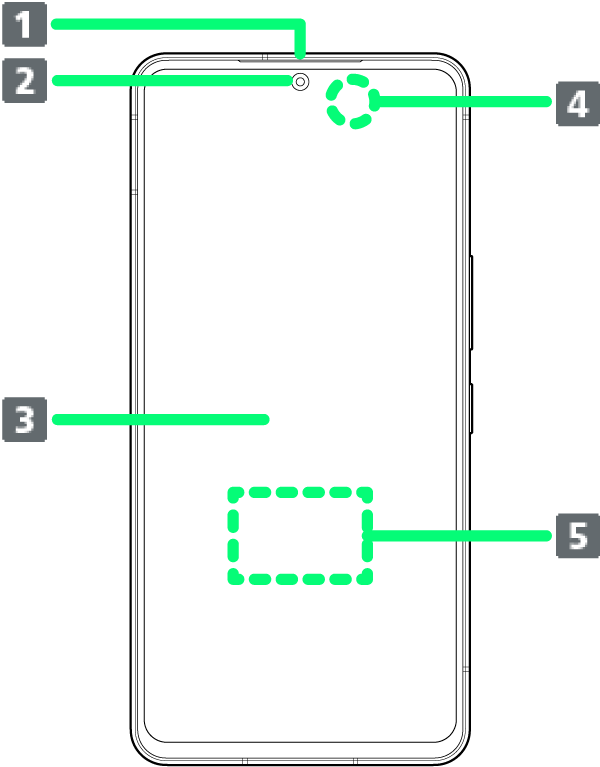| 近接/明るさセンサー1 | 近接センサーは通話中にタッチパネルの誤動作を防ぎます。明るさセンサーは周囲の明るさに合わせて、ディスプレイの明るさを調節します。 |