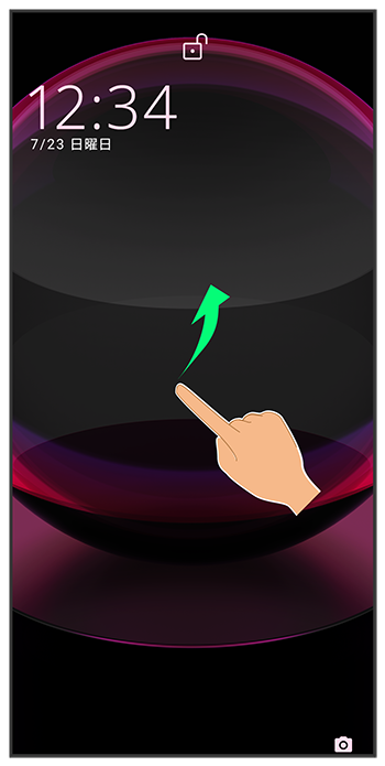 が表示されている場合に画面を上にフリックしたときは、このあとパターン/ロックNo.(PIN)/パスワードを入力してロックを解除する操作が必要です。