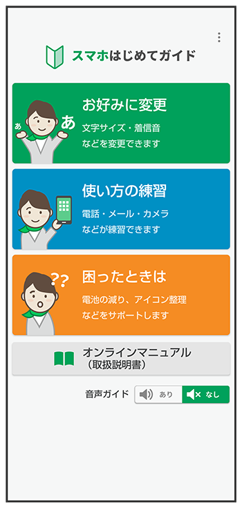 スマホはじめてガイドは、スマホでよく使う機能の練習や、基本的な設定をかんたんに行うことができます。
