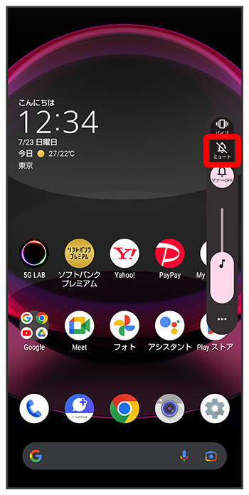 音量Upキー/音量Downキーを押して音量バーを表示させ、マナーモードが解除されます。