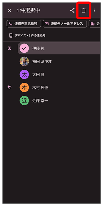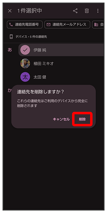 対象の連絡先をタップしても、対象の連絡先を選択できます。複数の連絡先を削除する場合は、続けてほかの対象の連絡先をタップします。