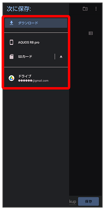- SDカードはSDカードを挿入している場合、Google ドライブはGoogle アカウントを設定している場合に表示されます。
