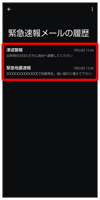 以前に受信した緊急速報メールを確認する