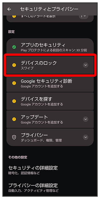 - 画面ロック解除方法の設定について詳しくは、「パターンを指でなぞって画面ロックを解除するように設定する」、「ロックNo.(PIN)で画面ロックを解除するように設定する」、「パスワードで画面ロックを解除するように設定する」を参照してください。