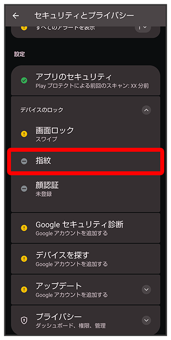 指紋設定画面でパターン/ロックNo.(PIN)/パスワードを入力登録した指紋をタップ名前を入力指紋を削除する
