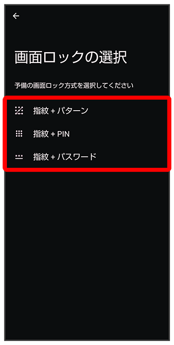 - 指紋認証ができないときの予備の画面ロック解除方法になります。