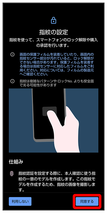 - 画面保護フィルムを装着する場合は、指紋センサーに対応したフィルムをご利用ください。また、画面保護フィルムを装着した状態で指紋を登録してください。