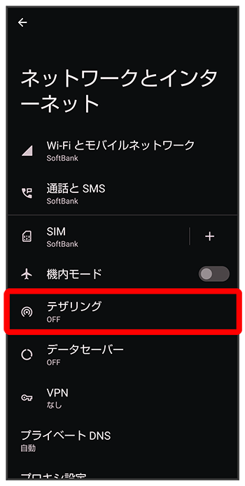 | Bluetooth テザリング | Bluetooth®接続でテザリング機能を利用するかどうかを設定します。 |