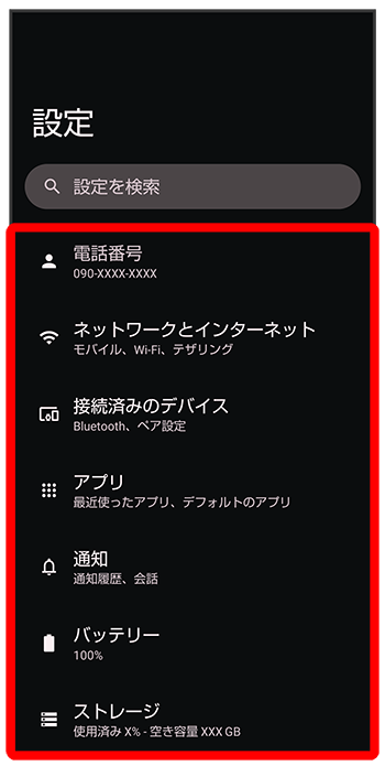 | ネットワークとインターネット | Wi-Fiやモバイルネットワーク、テザリングなど、ネットワークやインターネットに関する設定ができます。 |
