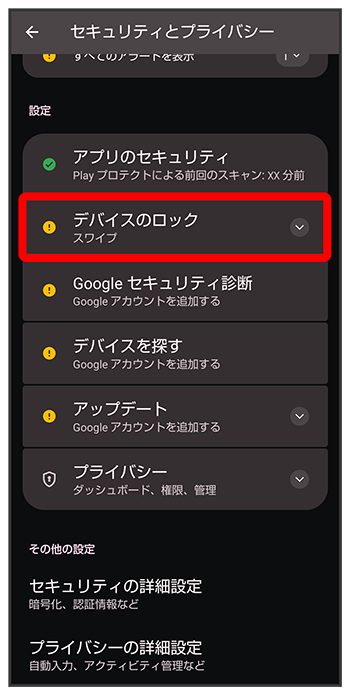- 画面ロック解除方法の設定について詳しくは、「パターンを指でなぞって画面ロックを解除するように設定する」、「ロックNo.(PIN)で画面ロックを解除するように設定する」、「パスワードで画面ロックを解除するように設定する」を参照してください。