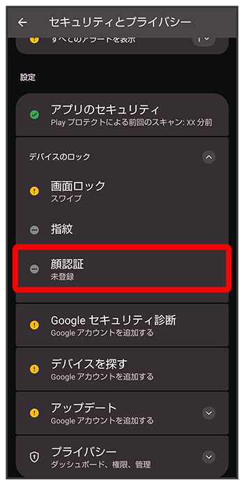 セキュリティとプライバシー画面でパターン/ロックNo.(PIN)/パスワードを入力マスクをしたままでも顔認証をするかどうかを設定する