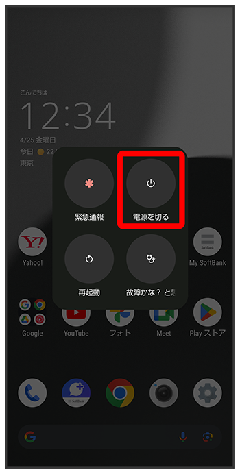 画面ロック解除用のパターン/ロックNo.(PIN)/パスワードを設定している場合や、顔認証機能や指紋認証機能を利用している場合、電源メニューにが表示されます。