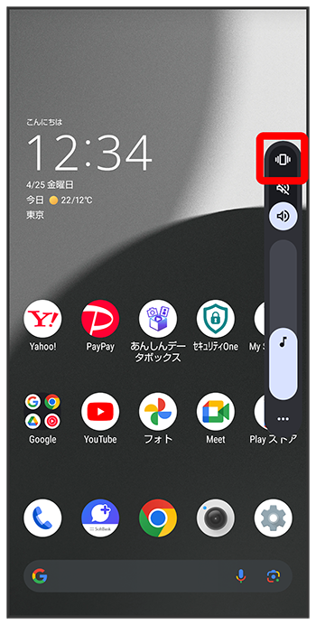 音量Upキー/音量Downキーを押して音量バーを表示させ、マナーモードが解除されます。