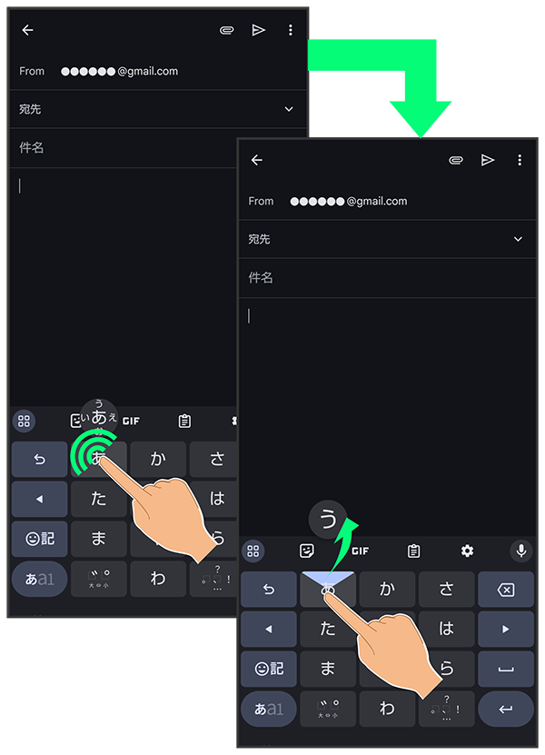 - キーをロングタッチすると、キー入力ガイドがポップアップで表示されます。キーをタップしたまま入力する文字の方向へフリックし、入力します。