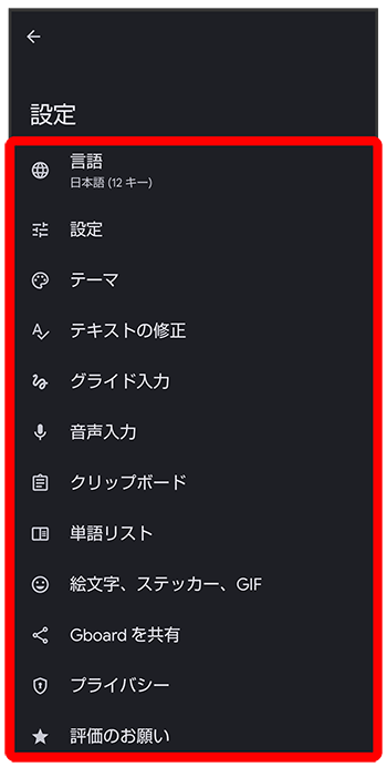 Gboardに関する動作を設定できます。設定できる項目は次のとおりです。