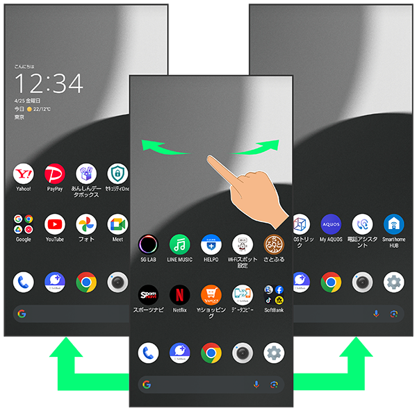 各シートを左右にフリックすると、ホーム画面シートを切り替えることができます。