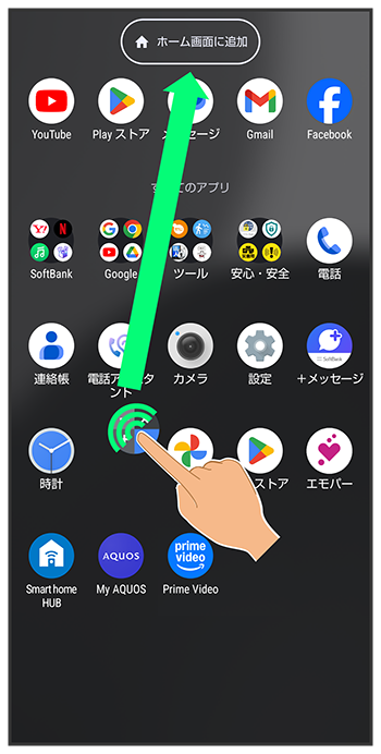 アプリ一覧画面でアプリをロングタッチし、「ホーム画面に追加」までドラッグ