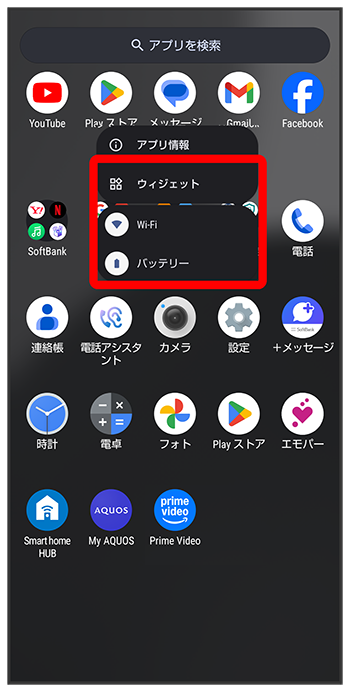 アプリをロングタッチすると、アプリにより機能へのショートカットが表示される場合があります。機能ショートカットをロングタッチし、ホーム画面の追加したい位置で指を離すと、機能へのショートカットとして追加することができます。