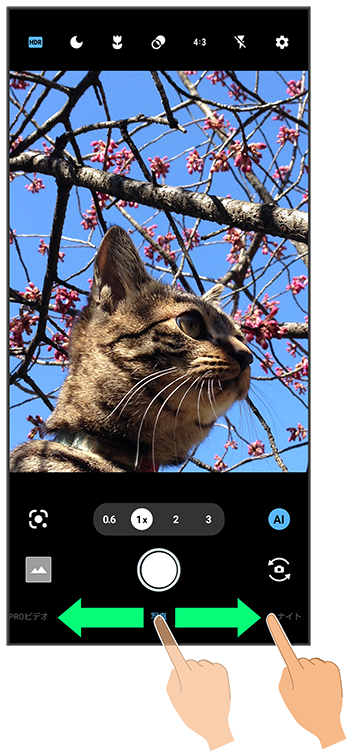 - 画面下部の撮影モードを左右にドラッグすると、からは