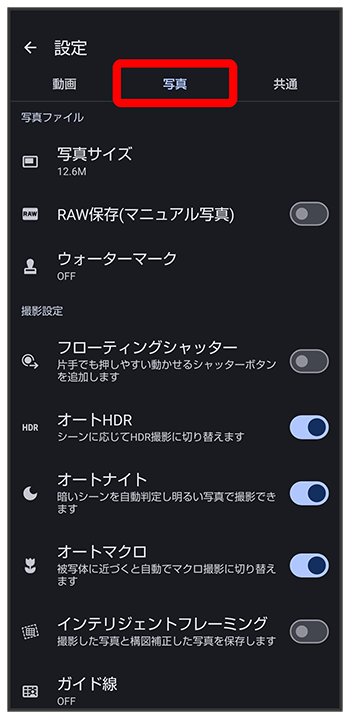 | オートマクロ | 撮影中に、ピントが合わせられない距離まで被写体に近づいたとき、自動で広角カメラに切り替えて撮影するかどうかを設定します。 |