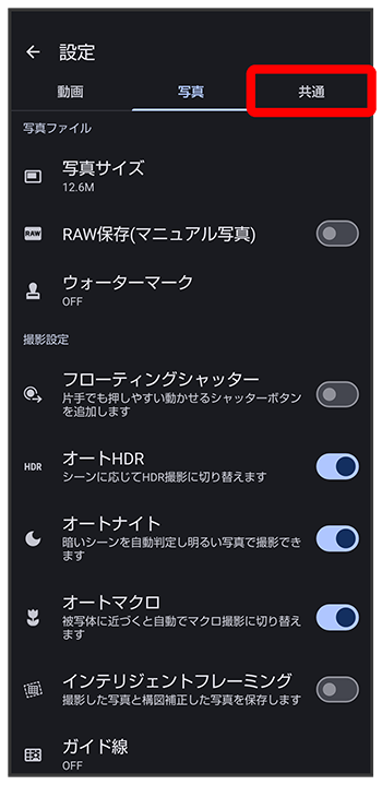 | セルフタイマー表示 | 写真/動画撮影画面にセルフタイマーのアイコンを表示するかどうかを設定します。 |
