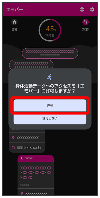アプリが本機の位置情報や身体活動情報などを利用することを許可します。