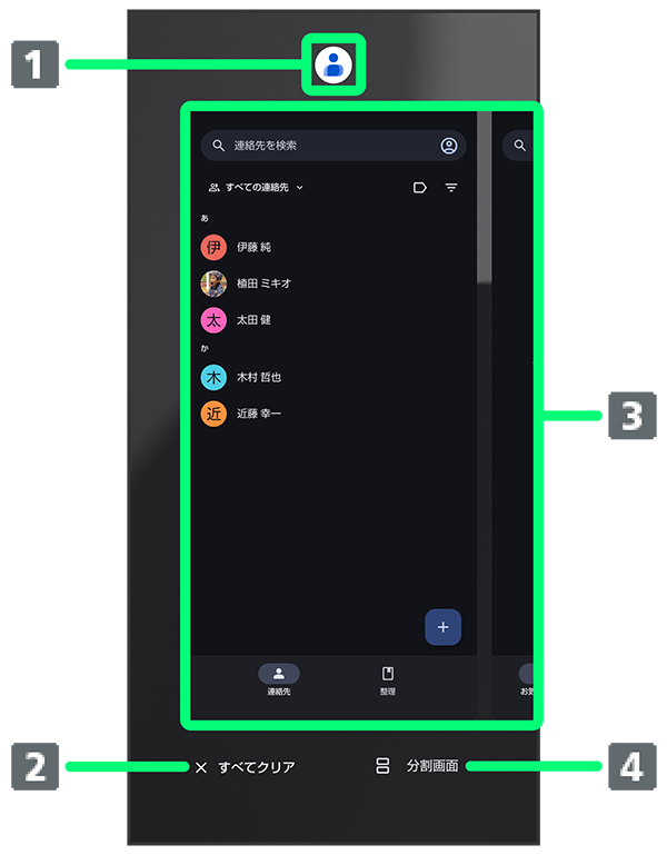 アプリの使用履歴画面で画面に従って操作- アプリの使用履歴画面でアプリの履歴のアイコンをタップと操作しても画面を分割できます。