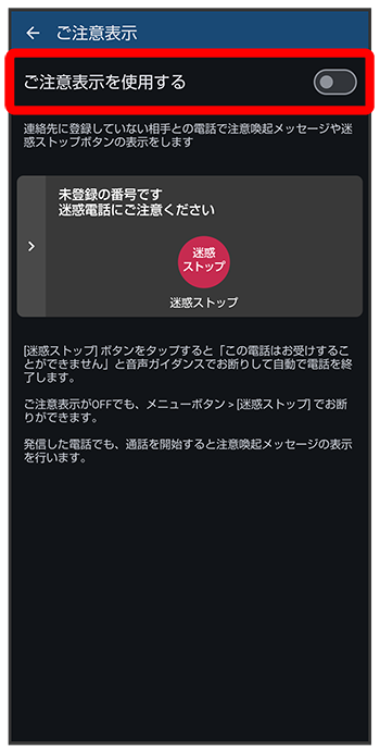 電話帳に登録していない電話番号や、発信者番号が非通知の相手からの着信/通話中に、注意を促す画面を表示します。