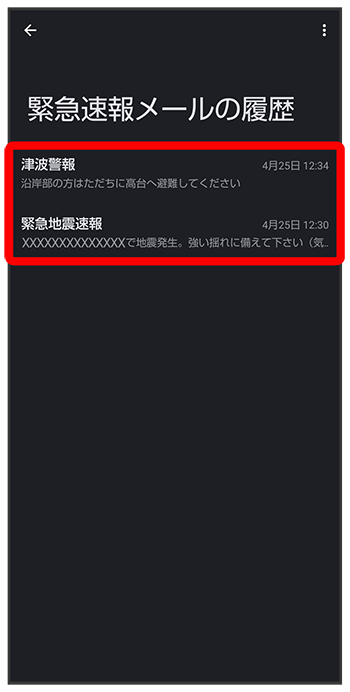 緊急速報メール受信メッセージ一覧画面が表示されます。
