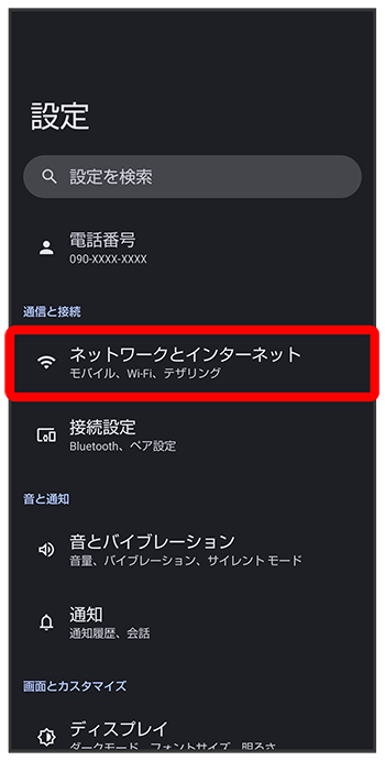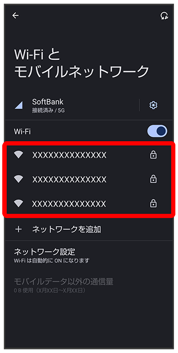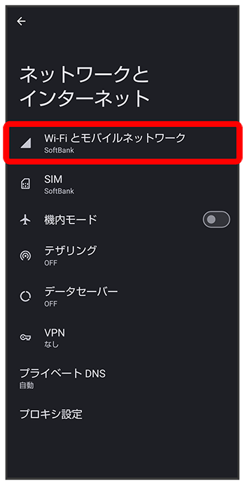 Wi-Fiとモバイルネットワーク画面が表示されます。