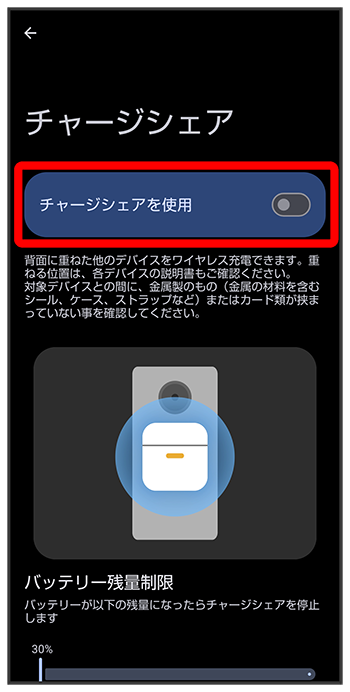 Qi規格準拠のワイヤレス充電対応機器を本機の背面に重ねて給電すること(チャージシェア)ができます。