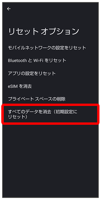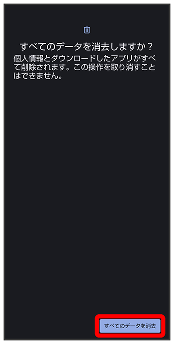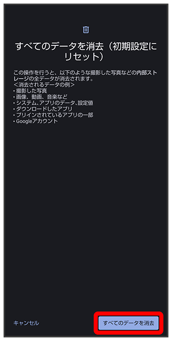 - 全データを消去(出荷時リセット)を行うと、内部ストレージのデータがすべて消去されます。必要なデータは事前にバックアップをとることをおすすめします。