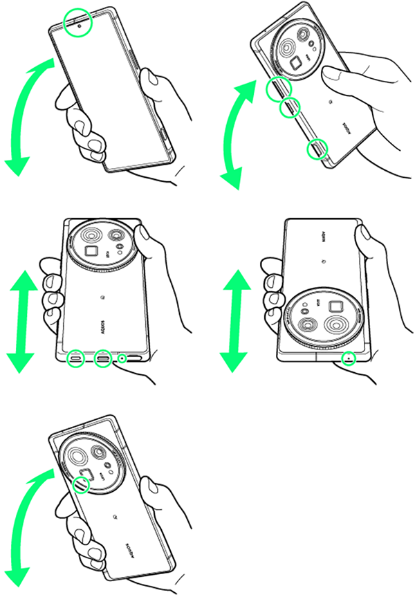 水に濡れたあとは、必ず「受話口/スピーカー」、「音量キー」、「電源キー」、「シャッターキー」、「スピーカー」、「外部接続端子」、「送話口/マイク」、「マイク」、「カメラパネル飾り(リング部)」の水抜きを行ってください。