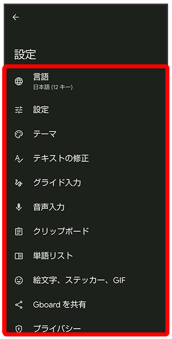 Gboardに関する動作を設定できます。設定できる項目は次のとおりです。