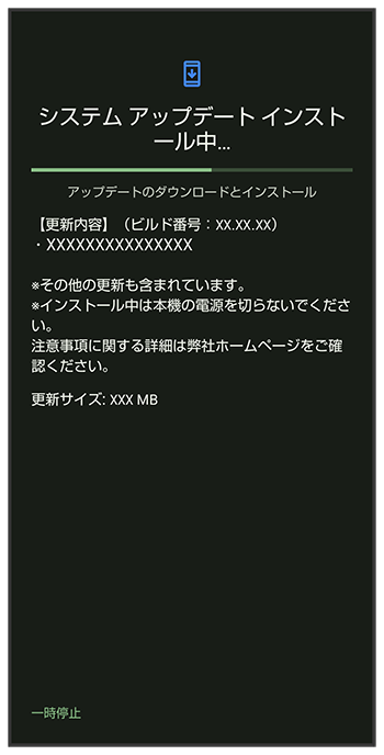 - システムアップデート中もほかの機能を使用できます。ただし、システムアップデートの通知後10日間は、システムアップデート中にほかの機能を使用していると、アップデートのインストールが一時的に停止されます。をタップすると、インストールが再開され、ほかの機能も使用可能になります。